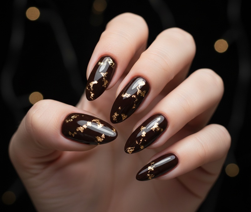 Brown and gold are a luxurious pairing. Adding gold leaf, foil, or chrome accents elevates a simple brown manicure into something glamorous. This style works beautifully for holiday events, formal occasions, or whenever you want sparkle without going over the top.